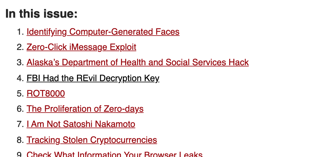 Here’s an example of what you might find in a given issue of Crypto-Gram: