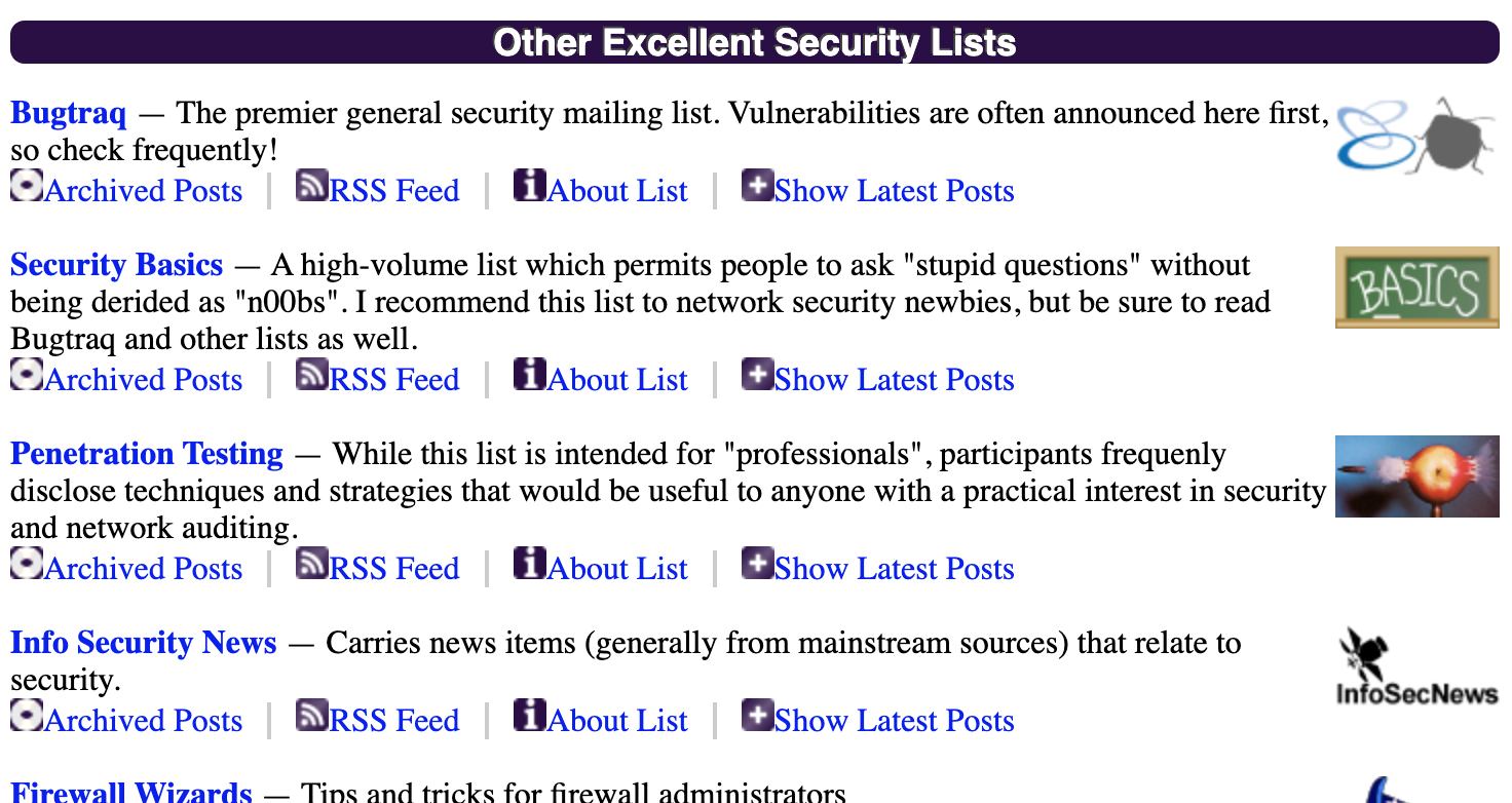 The reason I didn’t put seclists’ newsletters in their own section is because several of them (including Bugtraq 😢) have not been updated in a while and/or are discontinued. Still, there’s a ton of older posts that can be used for reference: