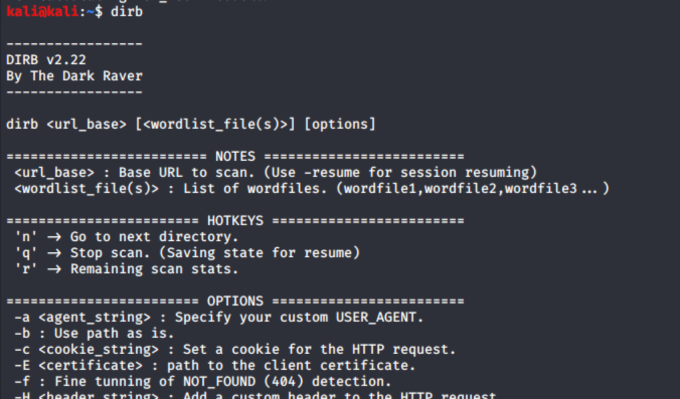 dirb <url_base> [<wordlist_file(s)>] [options]How to Install Dirb