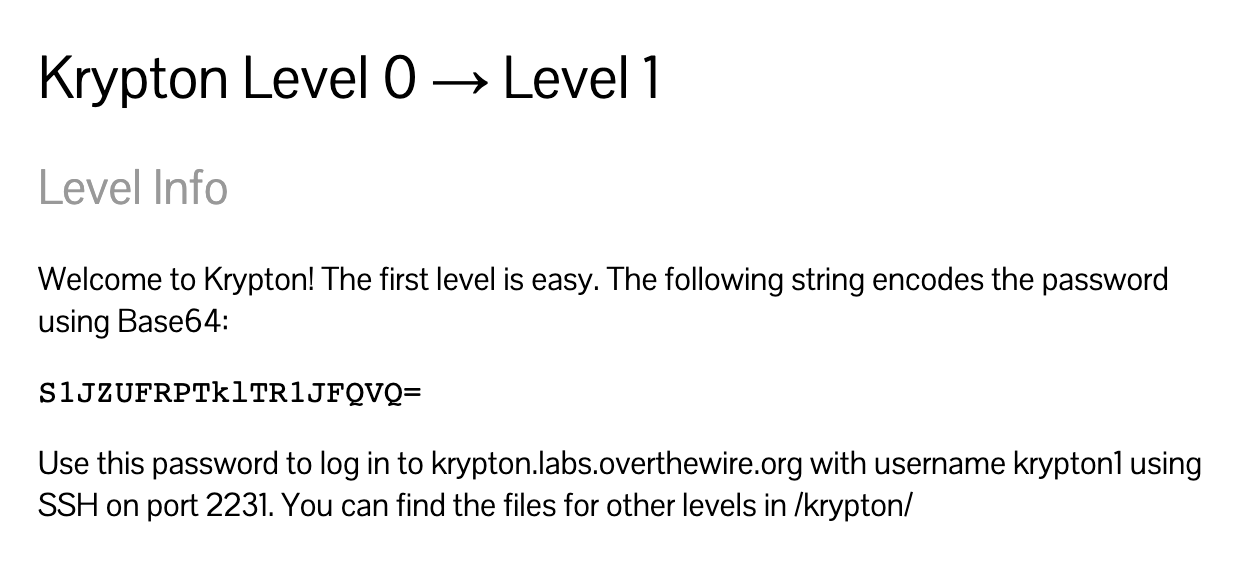 Head over to OverTheWire’s Krypton page to see the first level’s information: