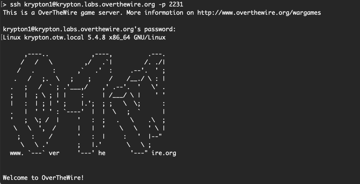 We’re instructed to SSH into the server with username krypton1, hostname krypton.labs.overthewire.org and port 2231. To do so, open up a terminal window and type the follow (where the $ is the prompt symbol and does not need to be added in by you):