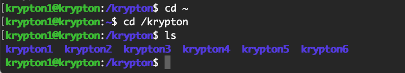 The rest of the welcome message says that Most LEVELS are stored in /somegame/. That means we should change directory (cd) to /krypton: