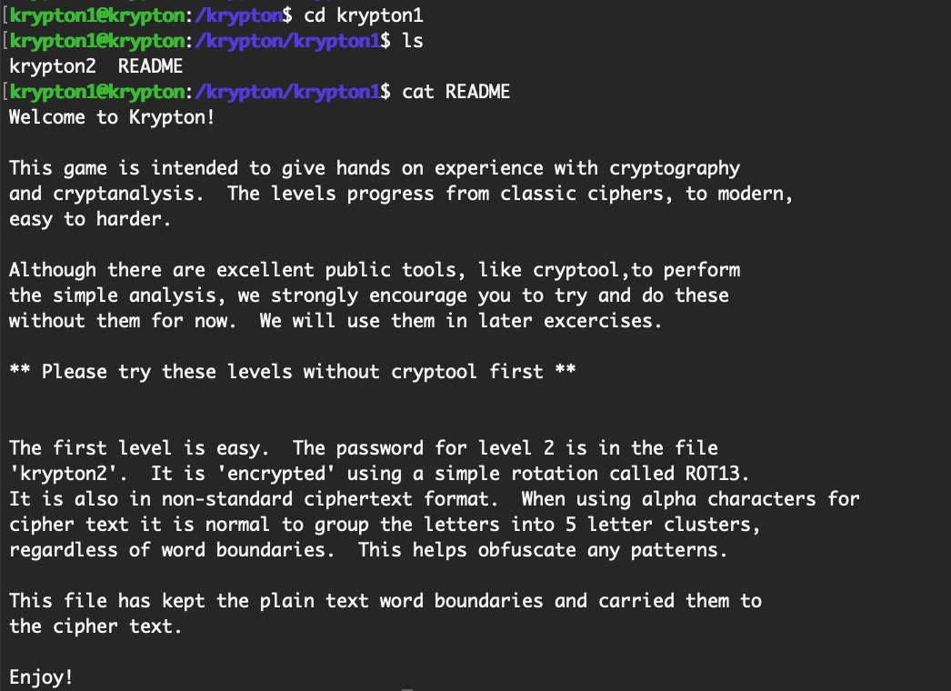 From there, we’ll need to cd into krypton1, and read the README: