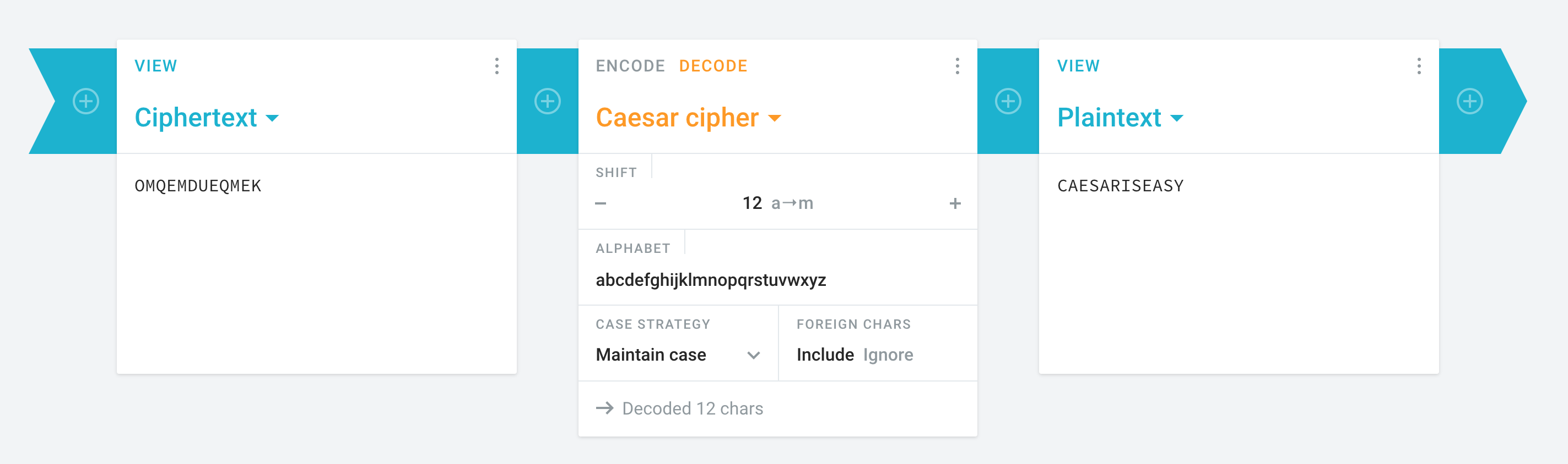 The value is M, meaning that we have a shift of 12 (from A to M, the 12th letter of the alphabet) to encode. To decode, we can use a tool like cryptii again, or shift the letters of OMQEMDUEQMEK 12 backwards, or 14 forwards (since 26 letters – 12 = 14) to wrap back around.