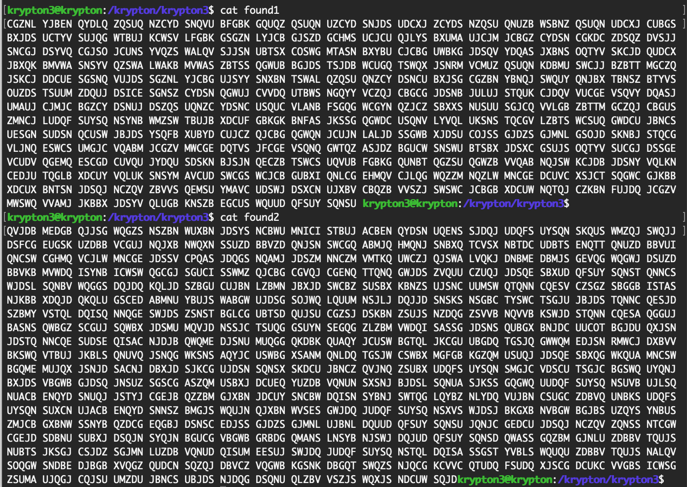 If we look at the available ciphertexts (found1, found2, etc), we notice that they’re all in a similar format of 5 letters separated by spaces. But we don’t know if that’s because of the cipher used, or a way of obfuscating any patterns.