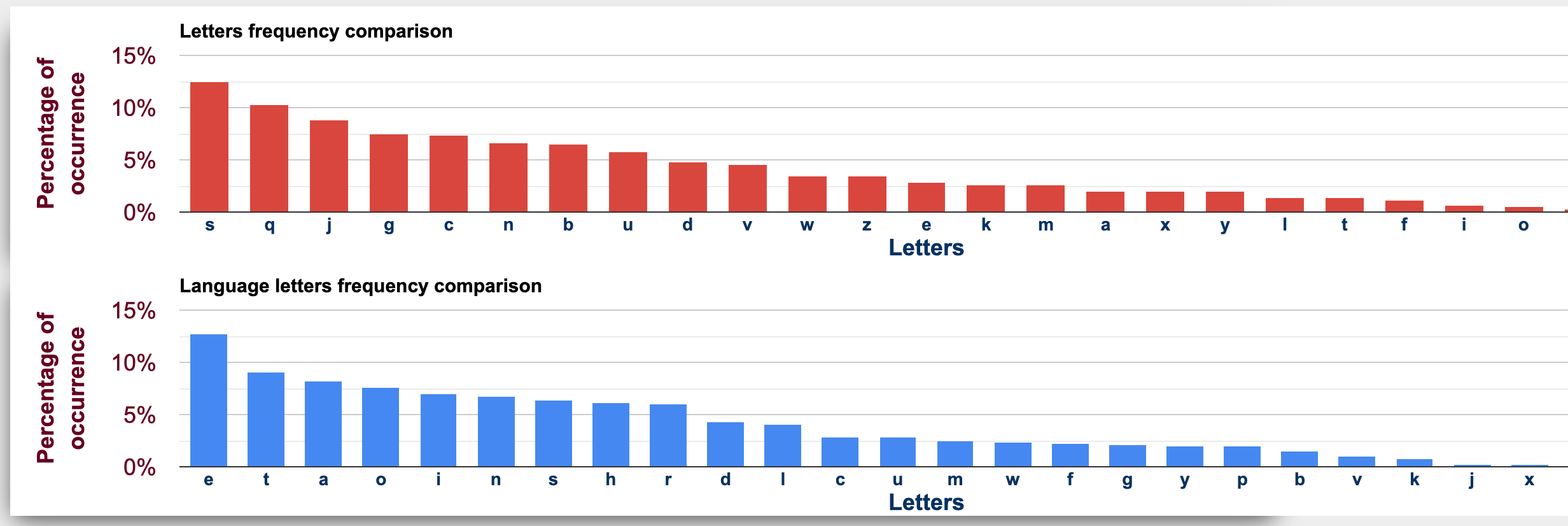 We can use a tool like this one to map out the frequency of letters in our cipher texts against typical frequency of letters in English texts: