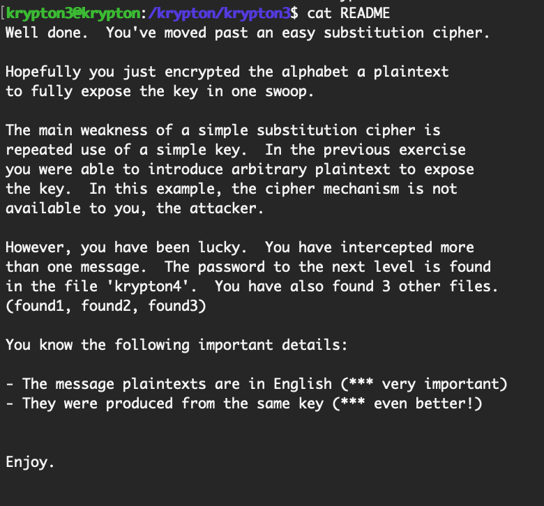 The README says that the original texts are in English. Why does this matter? It’s likely a hint that we need to use frequency analysis to find the key.