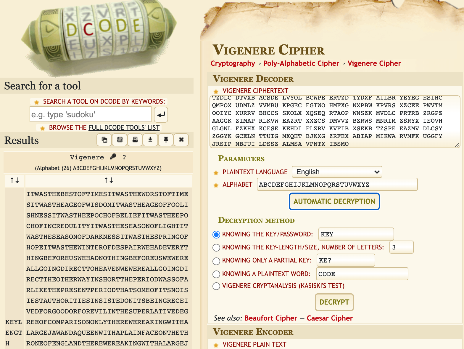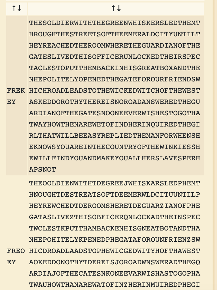 Hit Decrypt and it will show the best guess at the key. The first key of FREKEY seems to have correct, readable text: