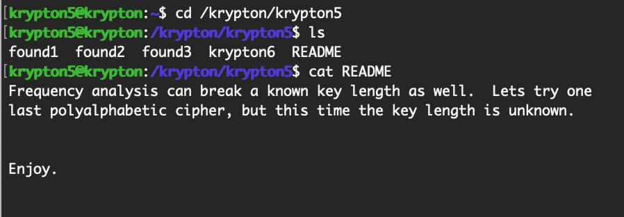 The README this time says no key length will be provided. Our first goal then will be to figure out the key length, then use that to find the key (and make analysis easier on the tools we’re using).