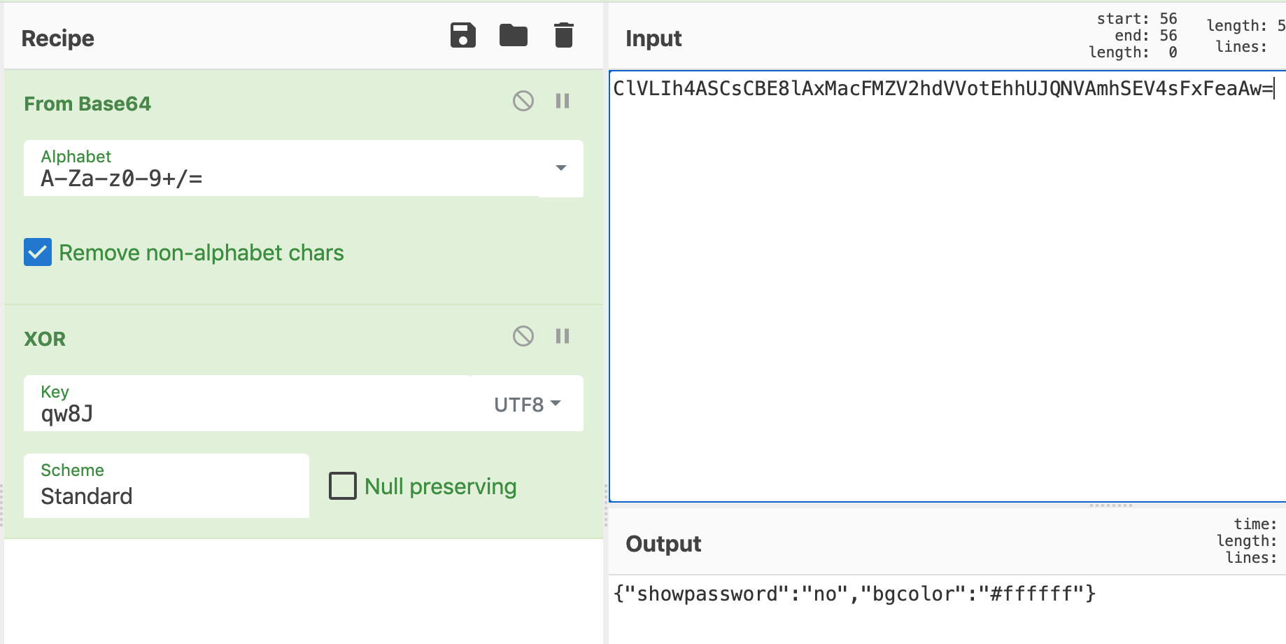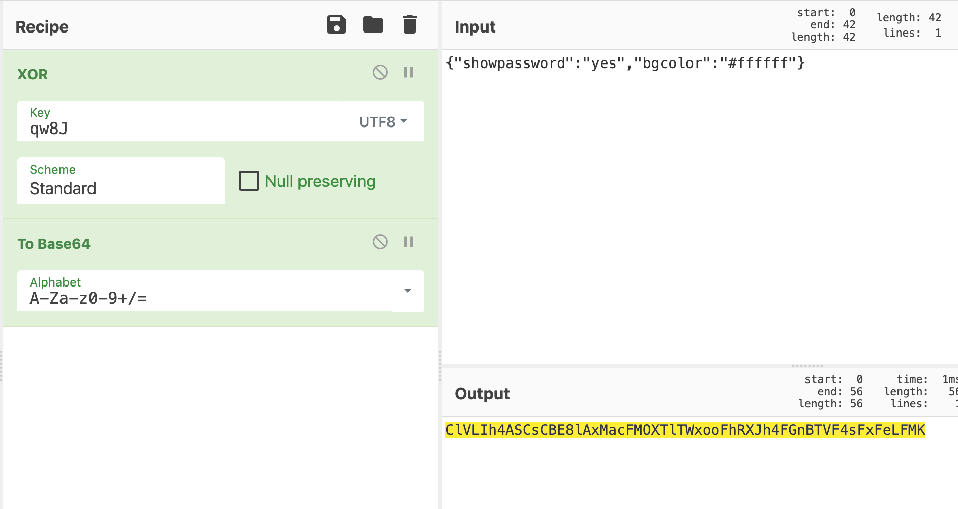 Now that we have the key, let’s make a JSON object of {"showpassword":"yes","bgcolor":"#ffffff"}, then XOR encrypt it, and then base64-encode it.