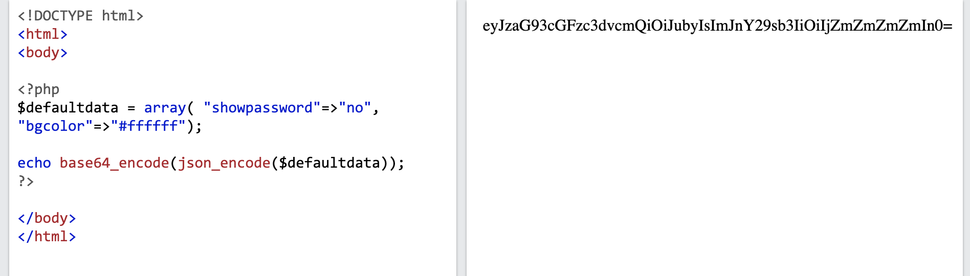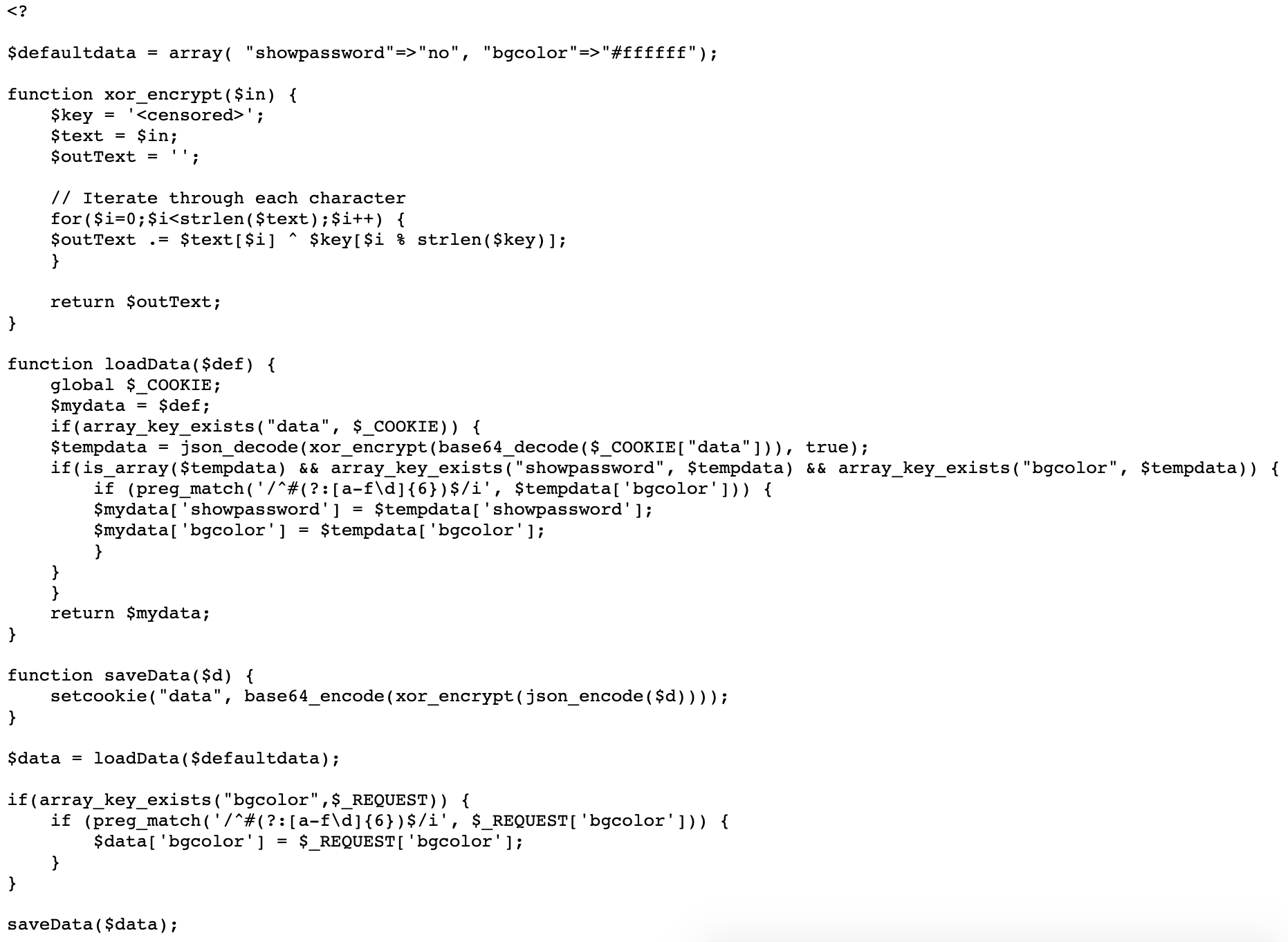 First, let’s use a PHP compiler to make a cookie without XOR encryption, using just array( "showpassword"=>"no", "bgcolor"=>"#ffffff");