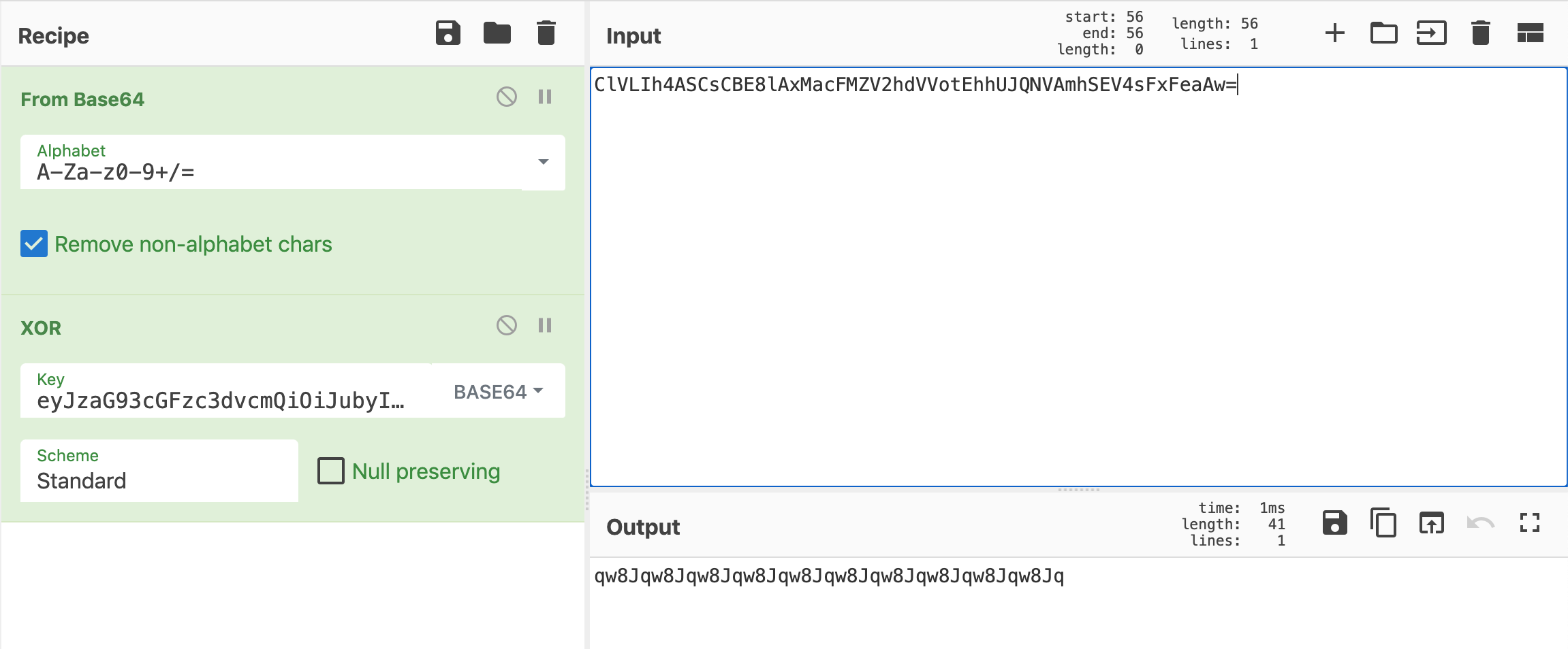 Use CyberChef or a similar tool to XOR ClVLIh4ASCsCBE8lAxMacFMZV2hdVVotEhhUJQNVAmhSEV4sFxFeaAw= with eyJzaG93cGFzc3dvcmQiOiJubyIsImJnY29sb3IiOiIjZmZmZmZmIn0=.