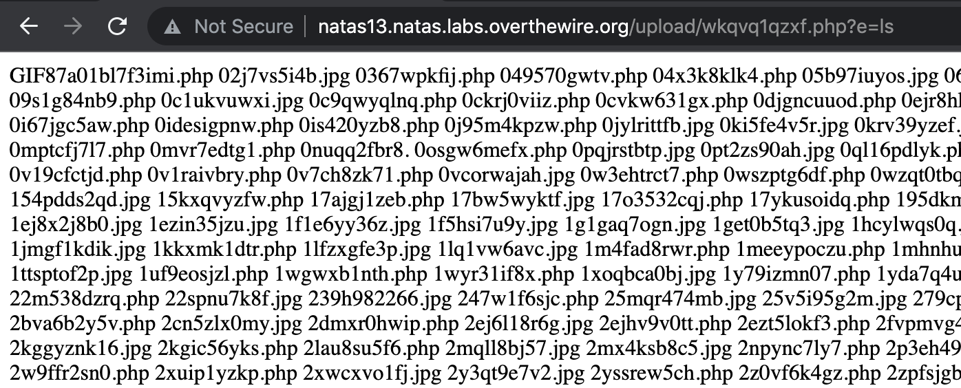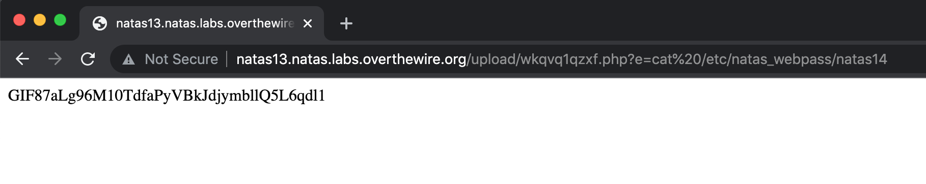 As with the last level, the flag turns out to be in /etc/natas_webpass/natas14 again. If we supply an input of ?e=cat /etc/natas_webpass/natas14 to our webshell, we get the flag: