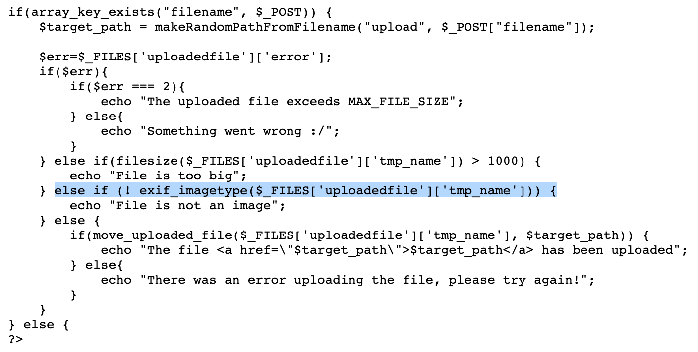 This PHP function reads the first few bytes of a file, sometimes known as “magic headers” to determine the file type. It won’t be fooled by just changing the file extension. If our file does not begin with the header bytes that indicate it actually is an image file, it will be rejected.