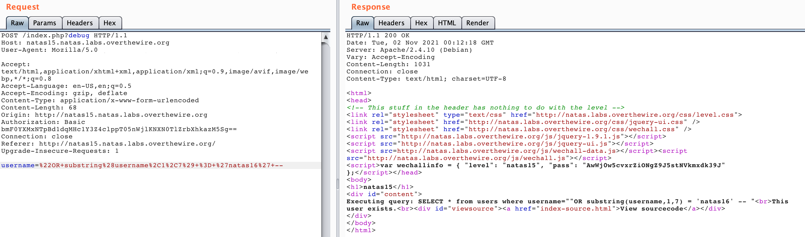 Of course, we could just search for a username equal to natas16 without the SQL injection, but this is meant to test the substring() call.