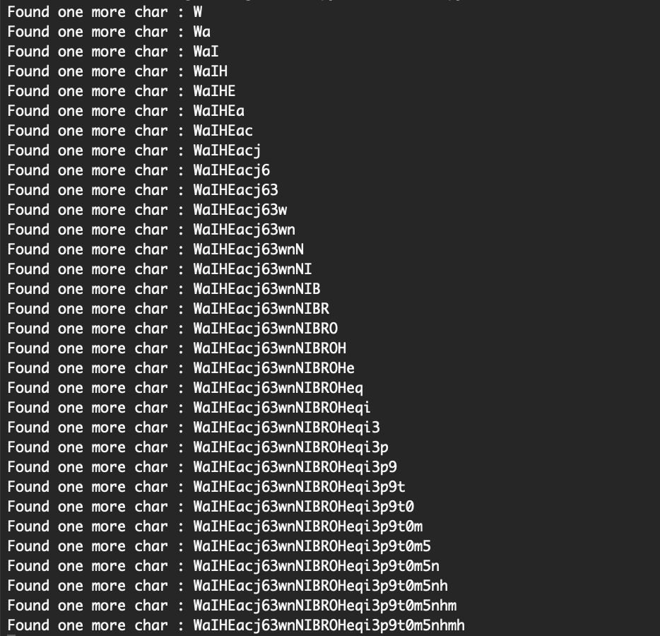 If you want to see more information you can un-comment print(payload). There are faster ways to do this but it works, and we get our password of WaIHEacj63wnNIBROHeqi3p9t0m5nhmh.