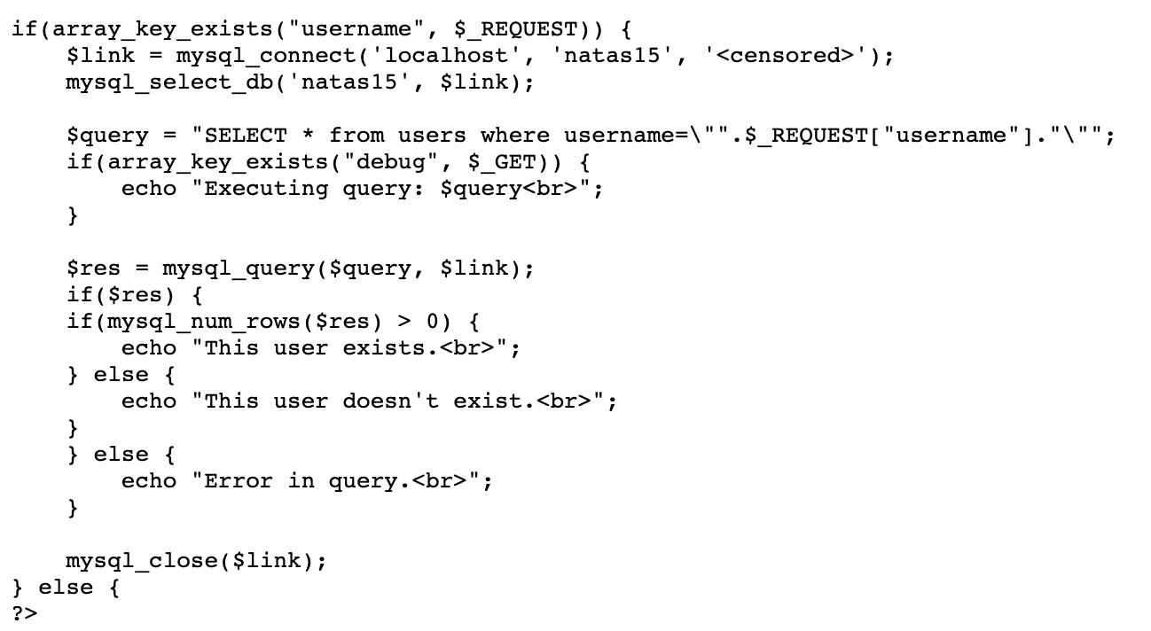 $query = "SELECT * from users where username=\"".$_REQUEST["username"]."\"";To summarize the source code, it looks to see: