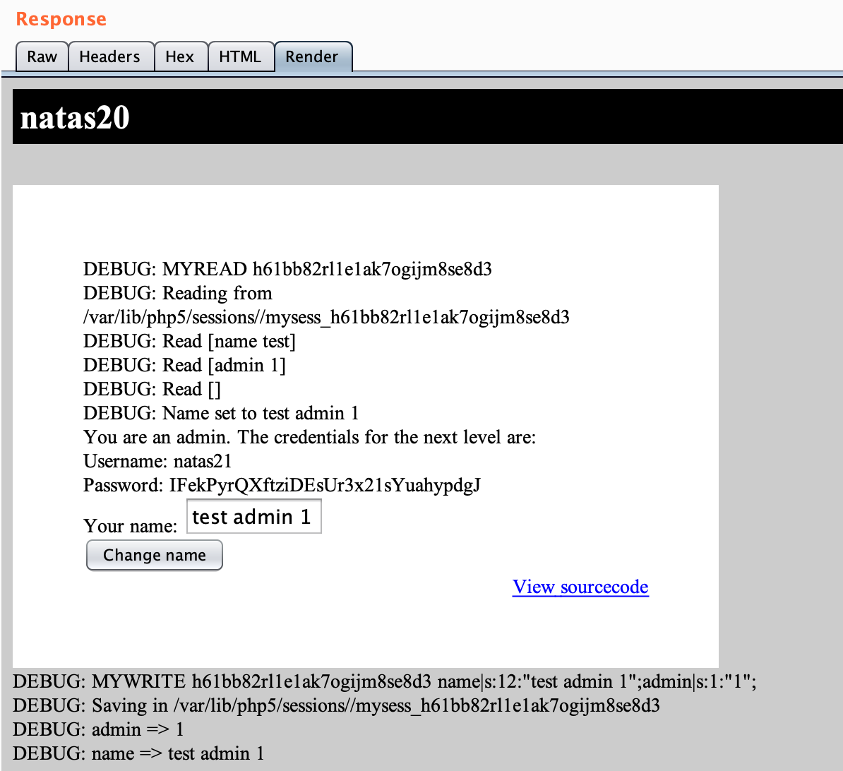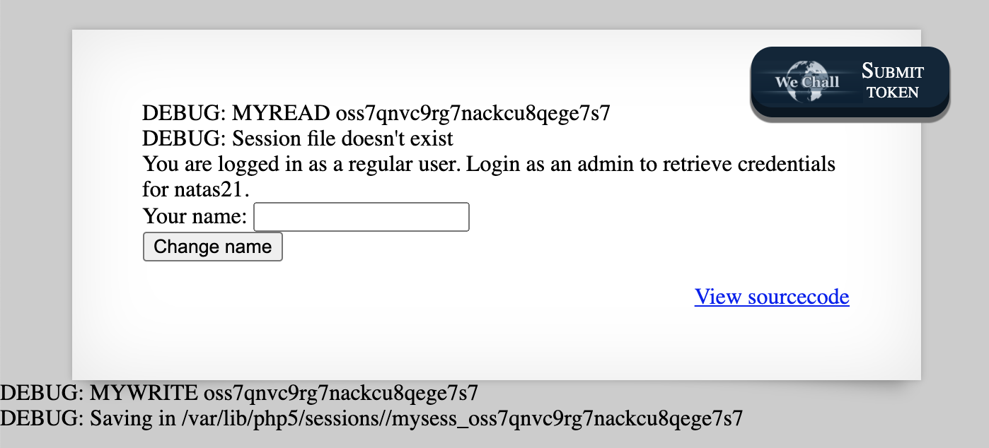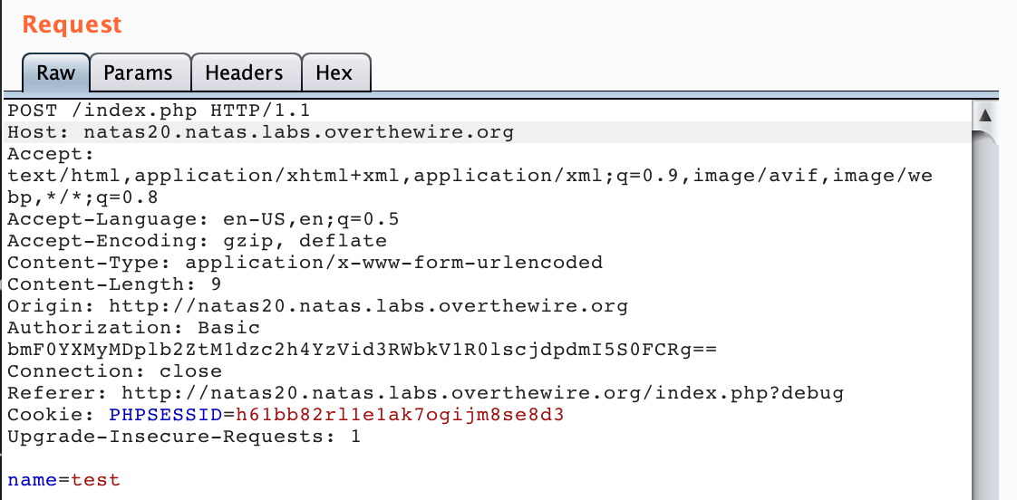 If we check the PHPSESSID cookie in Dev Tools, it ends up being a random string of characters. We’re given the source code, and as before, we can append ?debug to the URL (e.g. http://natas20.natas.labs.overthewire.org/index.php?debug) and see debug output: