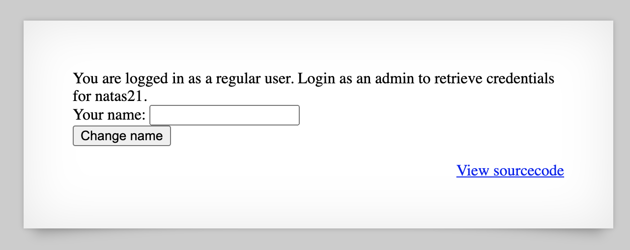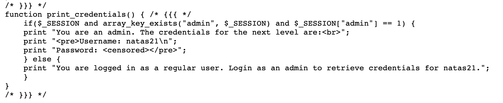 Our goal is to “login as an admin” in order to get natas21 credentials. In the source code, that happens here: