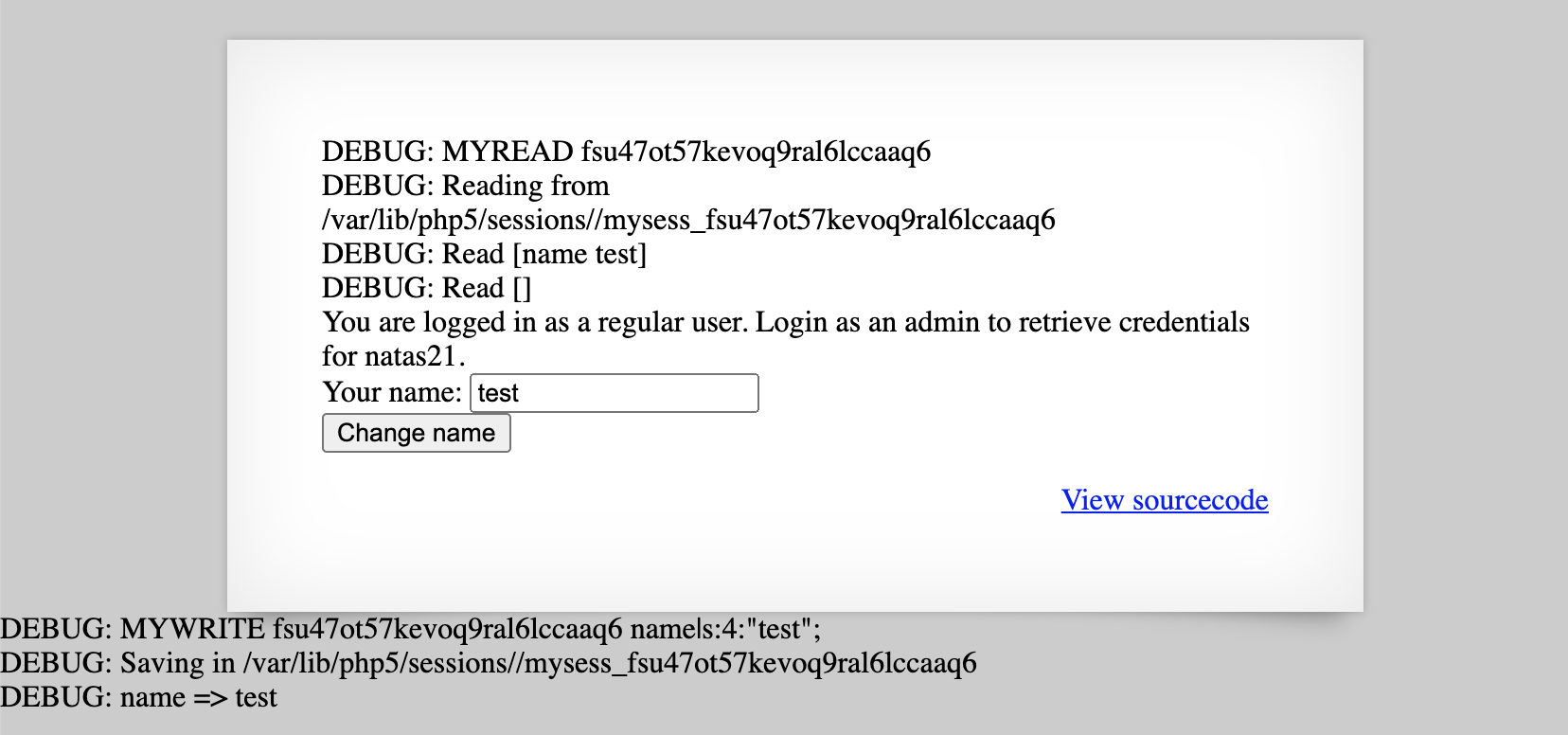 If we’re to submit a name in the input provided to us, mywrite() is called. If we have ?debug appended to our requested URL, we’ll get debug output printing the $sid (randomly assigned session ID) and $data.