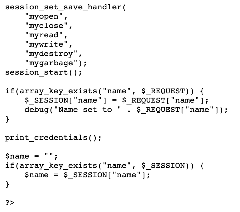 Of the functions specified in the session_set_save_handler() call, all but two are empty functions. That means we can effectively ignore myopen(), myclose(), mydestroy(), and mygarbage(). The remaining two are myread() and mywrite().