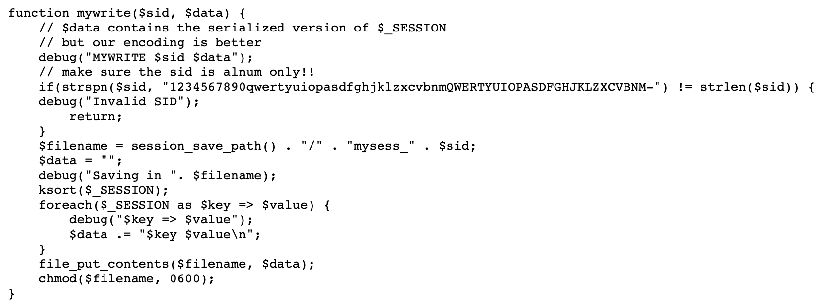 Next up is the myread() function, which takes a $sid value (the random PHPSESSID) and makes sure it is not doing any path traversal weirdness.