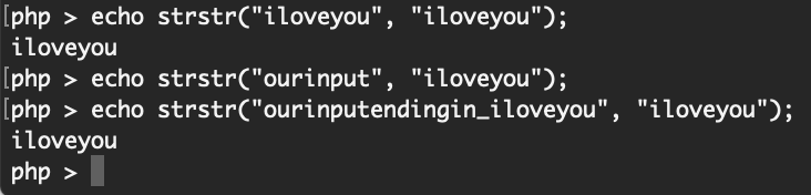 As you can see, anything that includes “iloveyou” in the first argument (which is our input) evaluates a non-zero output.