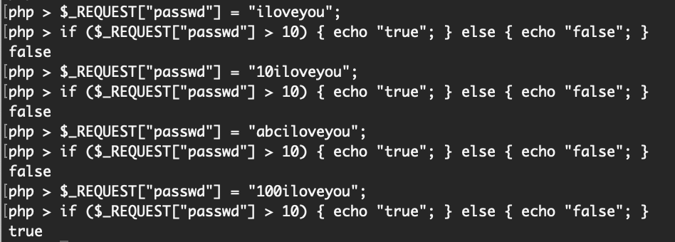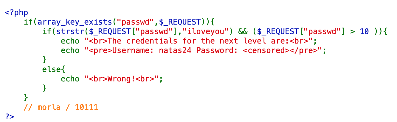 if(strstr($_REQUEST["passwd"],"iloveyou") && ($_REQUEST["passwd"] > 10 )){The PHP function strstr finds the first occurrence of a string and returns the part of the string starting from and including the first occurrence of the “needle” value (in our case, iloveyou).