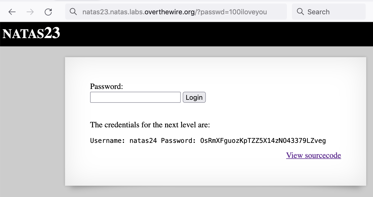 Each level requires the levels below it to be solved, so you will need the level 23 flag found in level 22 to begin this walkthrough. As before, make sure you keep notes and write down the passwords as you find them!