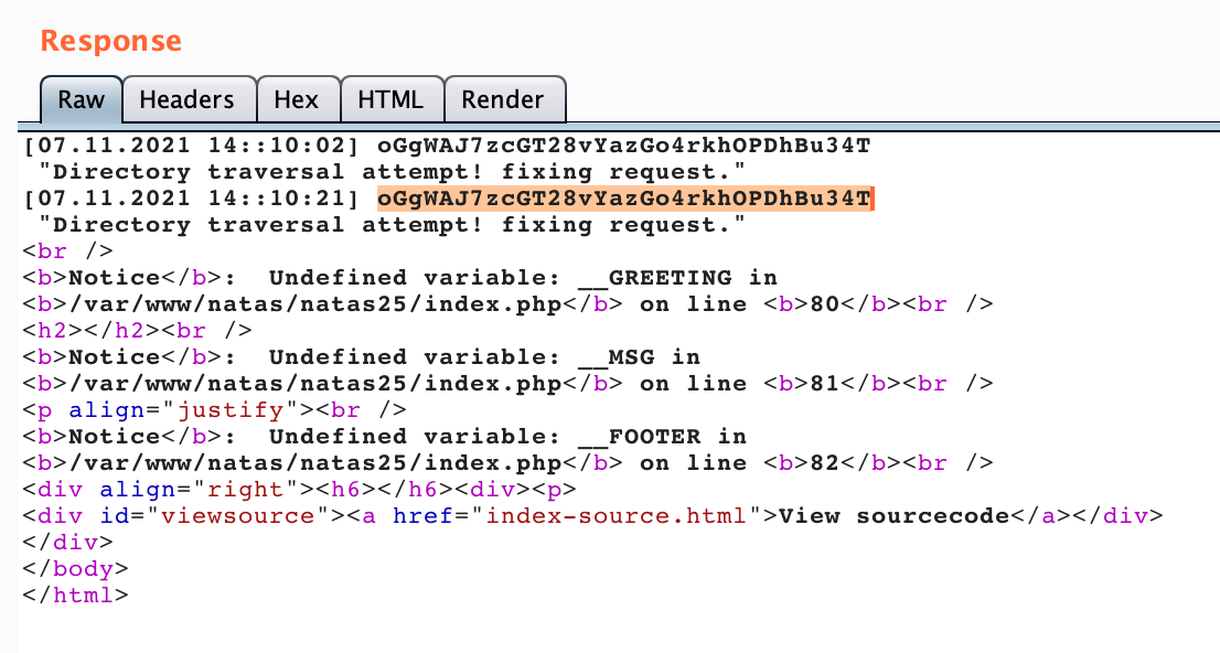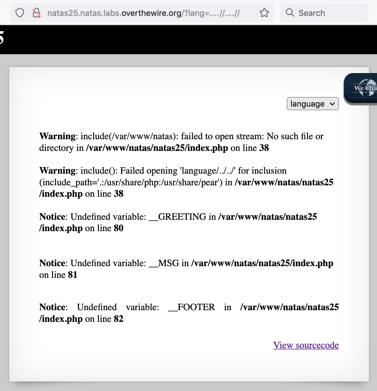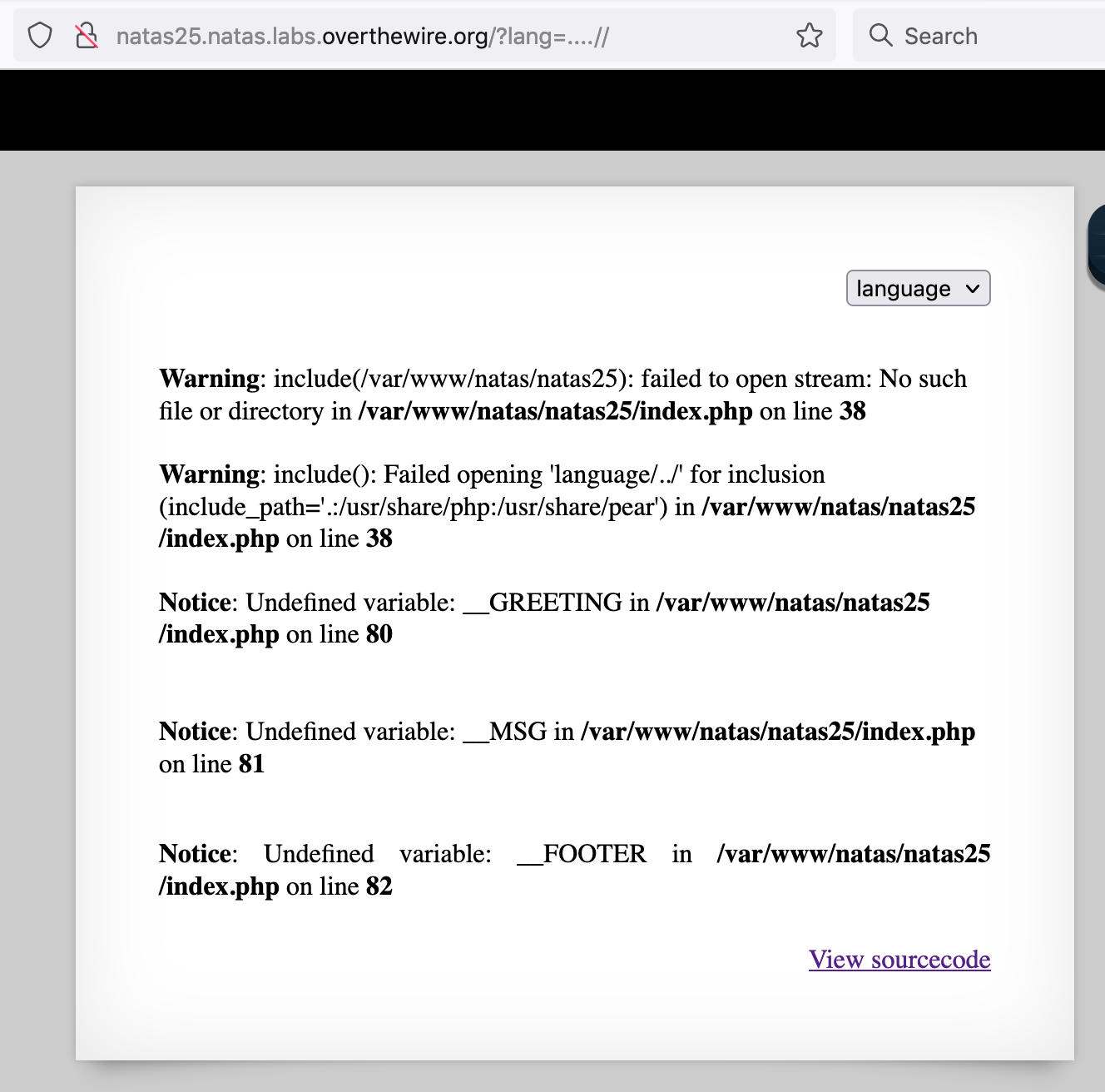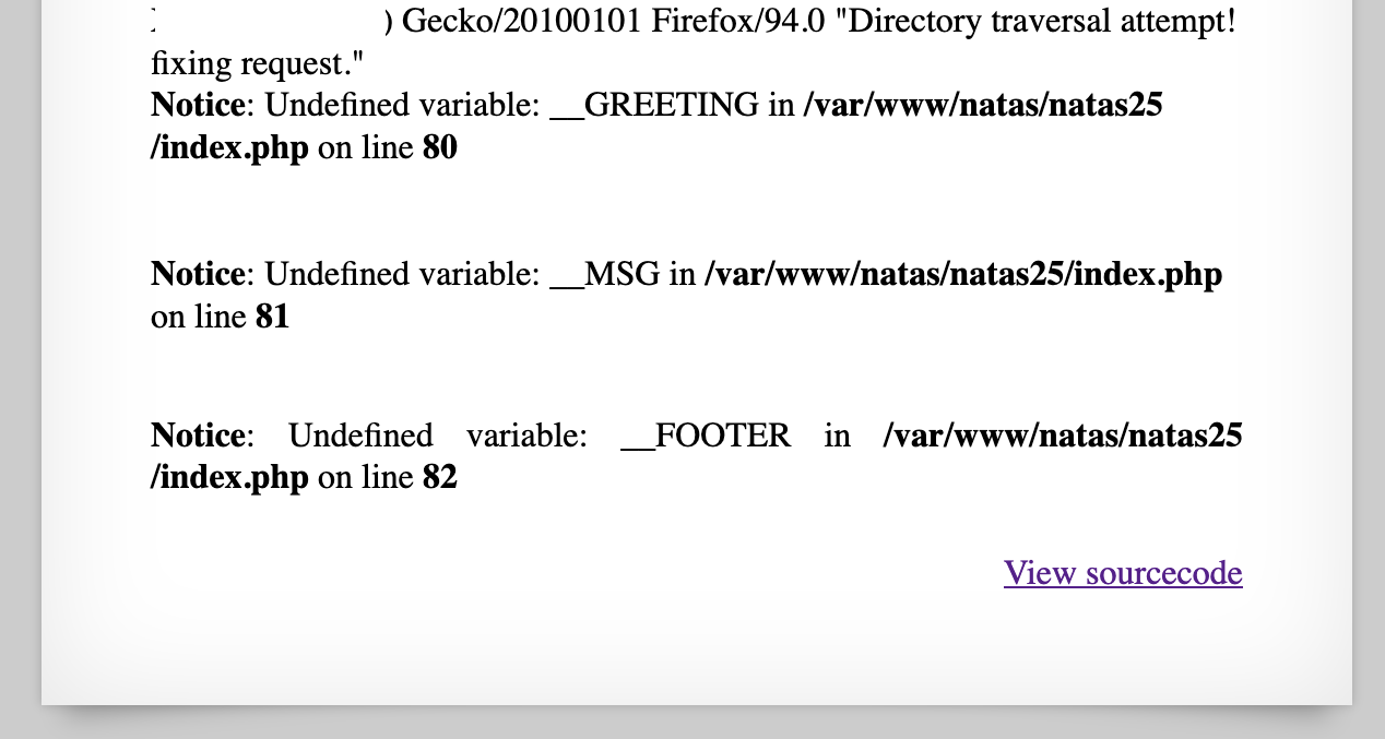 To make sure we’re on the right path, let’s add another layer of ....// and see if the warning goes up a directory (i.e. from Warning: include(/var/www/natas/natas25/language): to Warning: include(/var/www/natas/)):