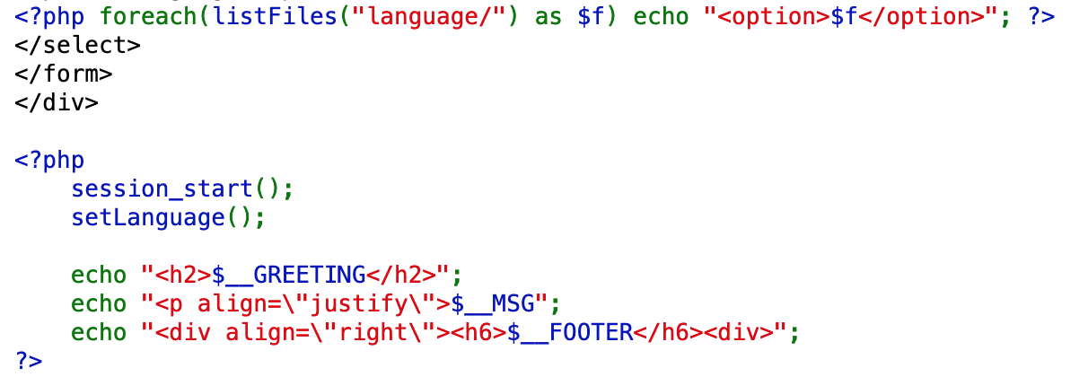 Then the session is started, setLanguage() is called, then the appropriate greeting, message, and footer values are displayed. The listFiles() function will get all the files in the given directory. So if the directory is language/en, it will return the file in that directory, which is what was displayed to us when we opened up the web app.