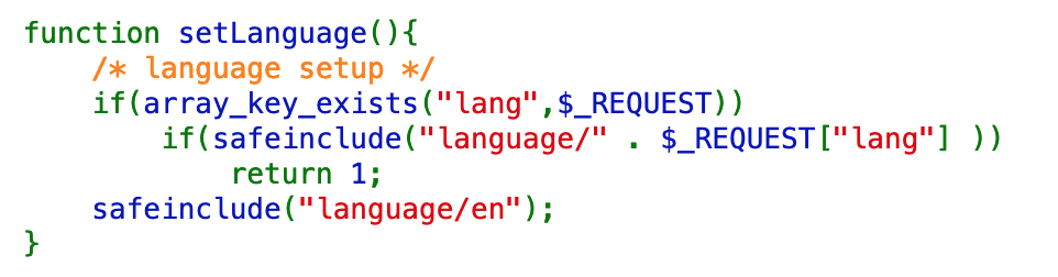 The setLanguage() function gets the language out of the request (lang) and checks it against the safeinclude() function. If no language is requested, it defaults to English.