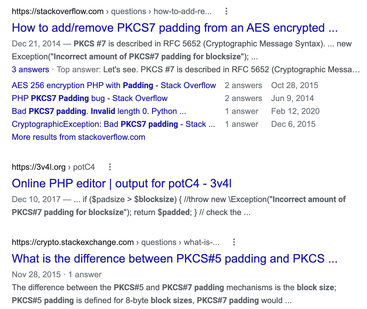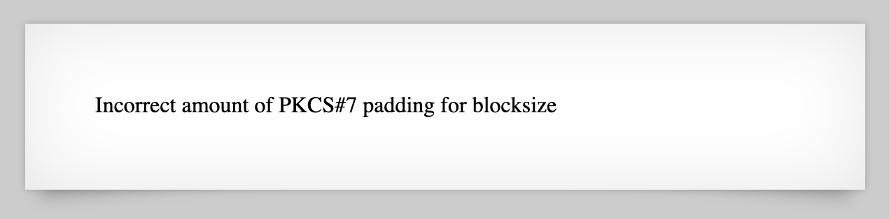 As mentioned earlier, I wasn’t familiar enough with cryptography to know exactly what this meant. It seemed like the error was somehow related to an AES block cipher encryption, where 1. there was a fixed block size of data to be encrypted/decrypted, and 2. the information was not conforming to this length, probably because I modified it.