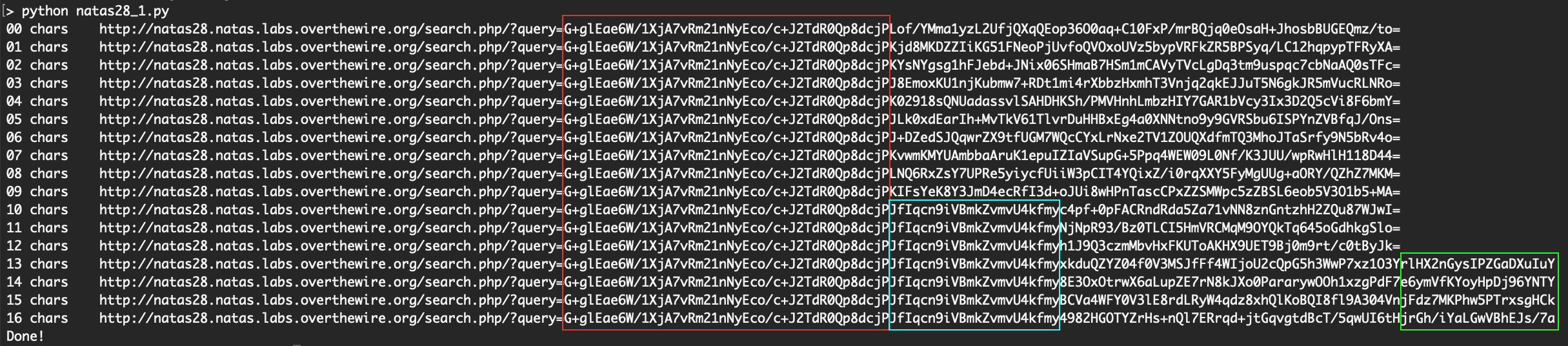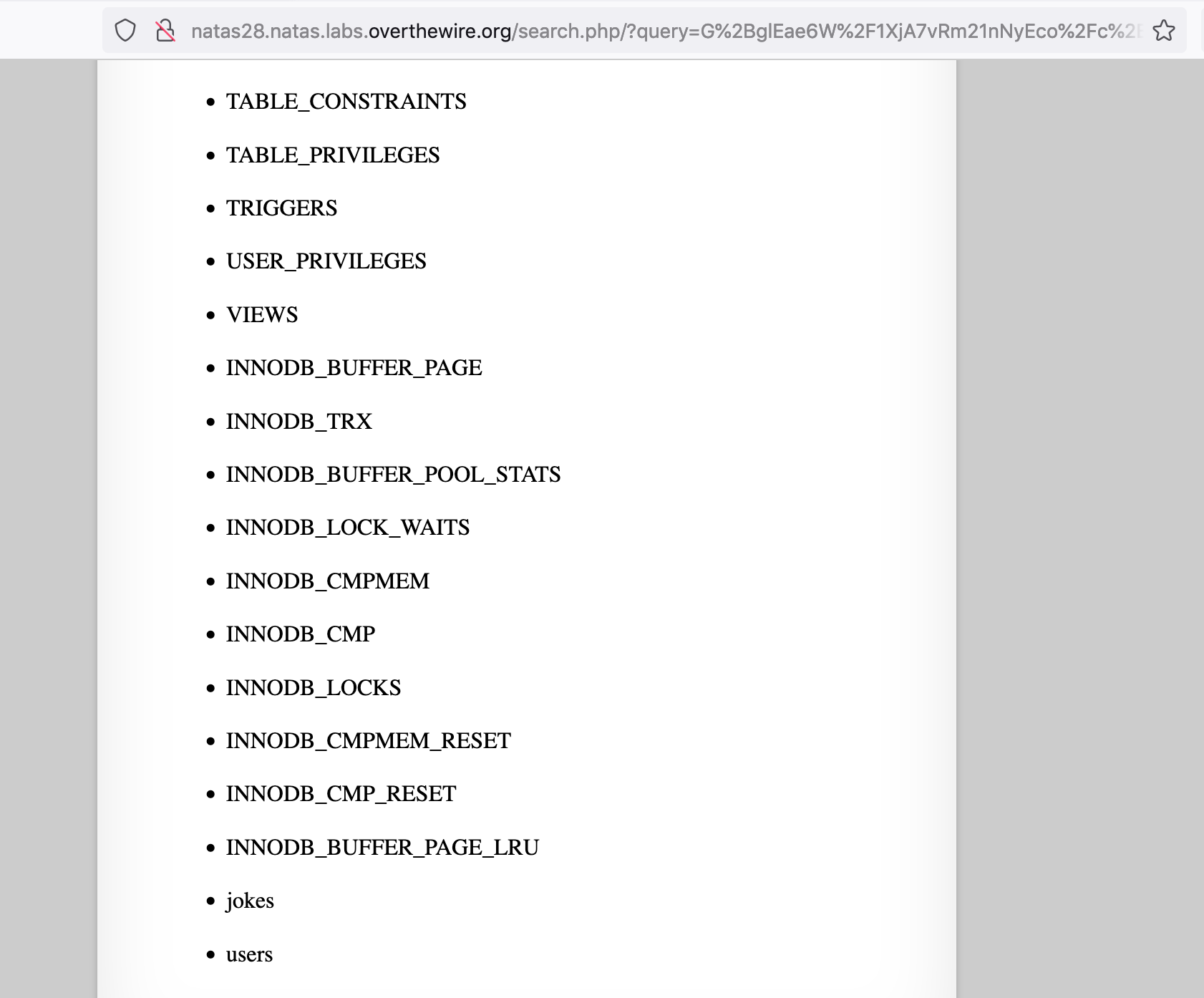 http://natas28.natas.labs.overthewire.org/search.php/?query=G%2BglEae6W%2F1XjA7vRm21nNyEco%2Fc%2BJ2TdR0Qp8dcjPItlMM3qTizkRB5P2zYxJsbWY4bHaEWFEfgtXy4iixC3kHAmMS6zcXtk1dWTlEF3X5k0NzIaCU2kq38vTeW0b%2BKc4pf%2B0pFACRndRda5Za71vNN8znGntzhH2ZQu87WJwI%3DWe seem to get a lot of results back, so I think it worked!