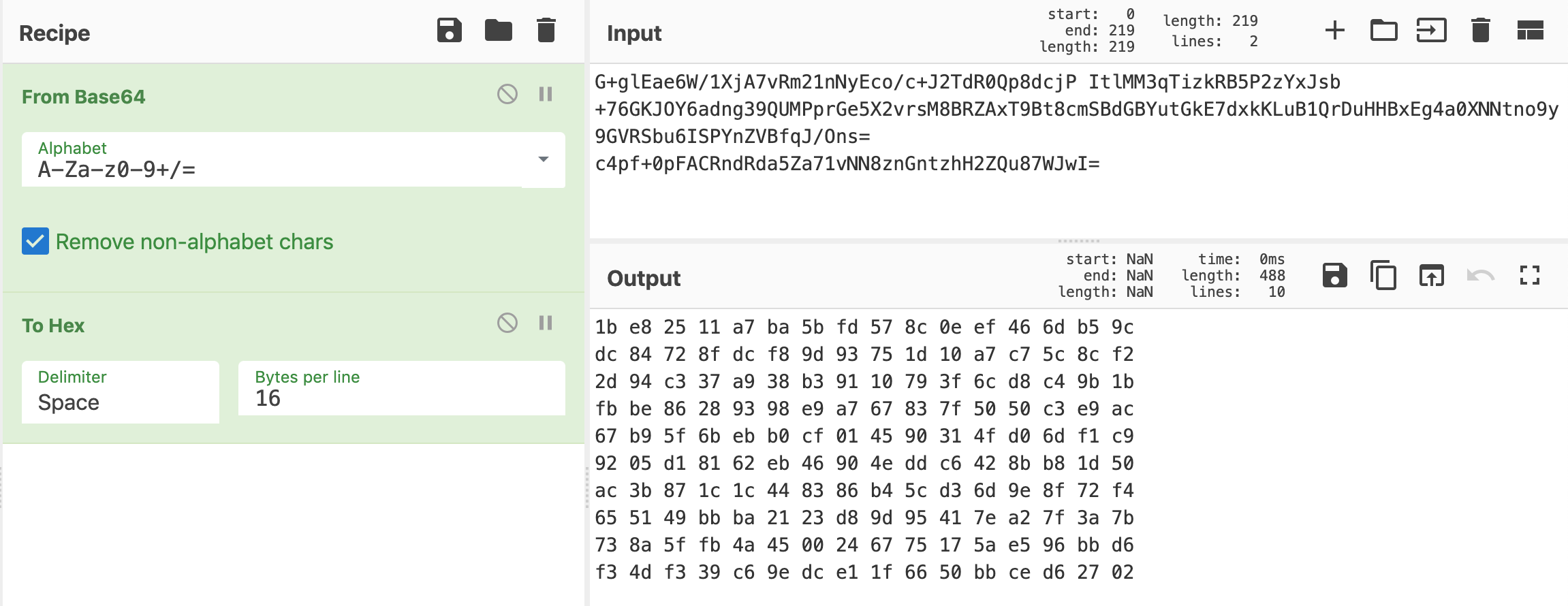 G+glEae6W/1XjA7vRm21nNyEco/c+J2TdR0Qp8dcjP ItlMM3qTizkRB5P2zYxJsb +76GKJOY6adng39QUMPprGe5X2vrsM8BRZAxT9Bt8cmSBdGBYutGkE7dxkKLuB1QrDuHHBxEg4a0XNNtno9y9GVRSbu6ISPYnZVBfqJ/Ons= c4pf+0pFACRndRda5Za71vNN8znGntzhH2ZQu87WJwI=This actually gave me some trouble, so I base64-decoded each of the sections in CyberChef, and used the resulting hex output in a new query where I re-encoded it as base64, then URL encoded it: