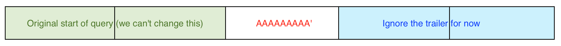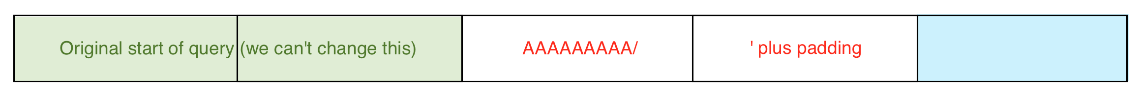The last piece is our SQL injection, which we’ll get to in just a minute. First let’s talk about the formula of the query. We will submit a query with AAAAAAAAA' (9 A’s and then a single quote), followed by our SQL injection.