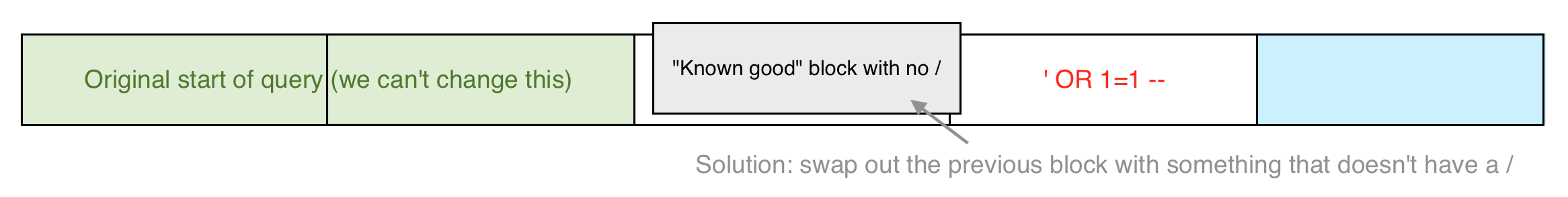 This is only possible because of the 9 As padding the query. This allows us to get the /' aligned right at the boundary of the 3rd and 4th blocks, such that we can swap out the 3rd block.