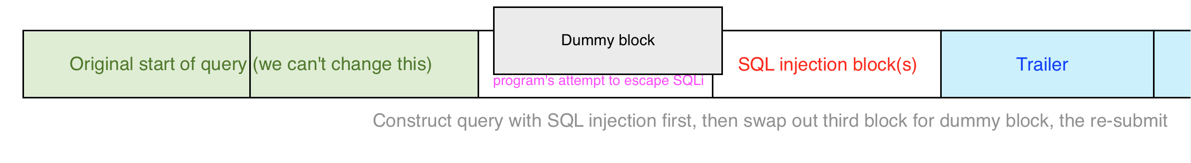 Third, we need a “dummy” block. This is the block that we will swap out in place of the escaped character that occurs in the third block in the diagrams above. The dummy block is represented in gray. If we make a query of 10 spaces, we get a query string (URL-decoded) of: