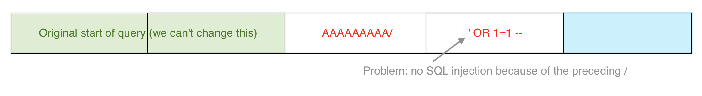 AAAAAAAAA' OR 1=1 -- The program will insert a / and this will push the ‘ into the next block (since it takes 10 characters to fill up the block, 9 A‘s and a / = 10 chars). We will effectively have sent this query: