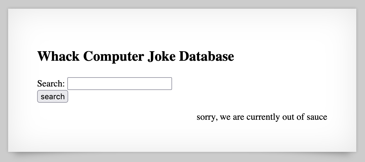 We aren’t given source code, but it does say that it’s a database. If we try SQL injection by submitting a search query of '… we don’t get anything useful. They must be escaping that character, as we get results back that have literal single quotes in them: