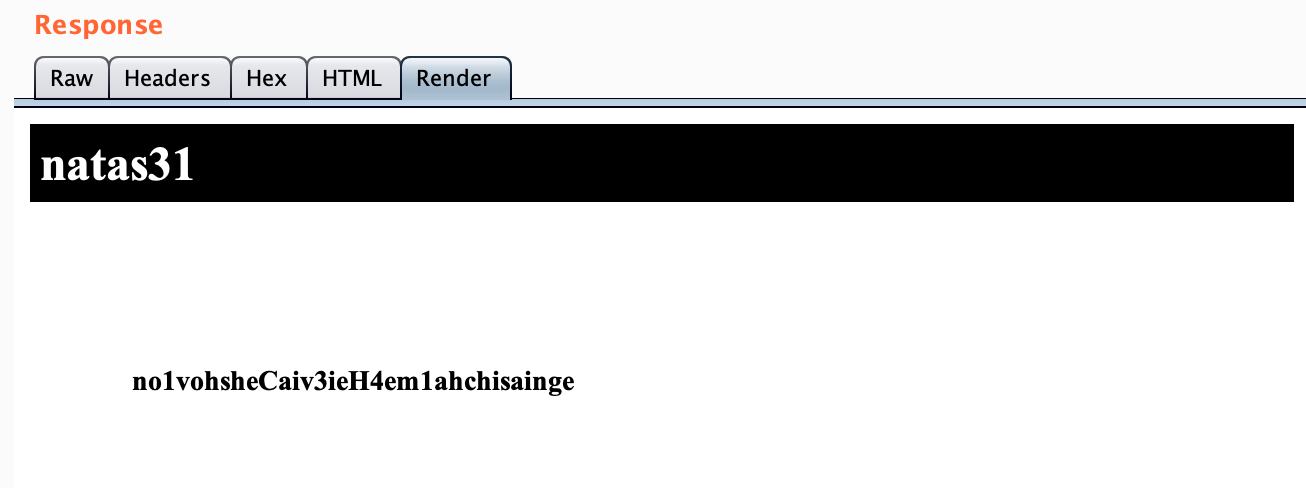 First things first, head over to http://natas31.natas.labs.overthewire.org and login with username natas31 and password hay7aecuungiuKaezuathuk9biin0pu1 from the last level.