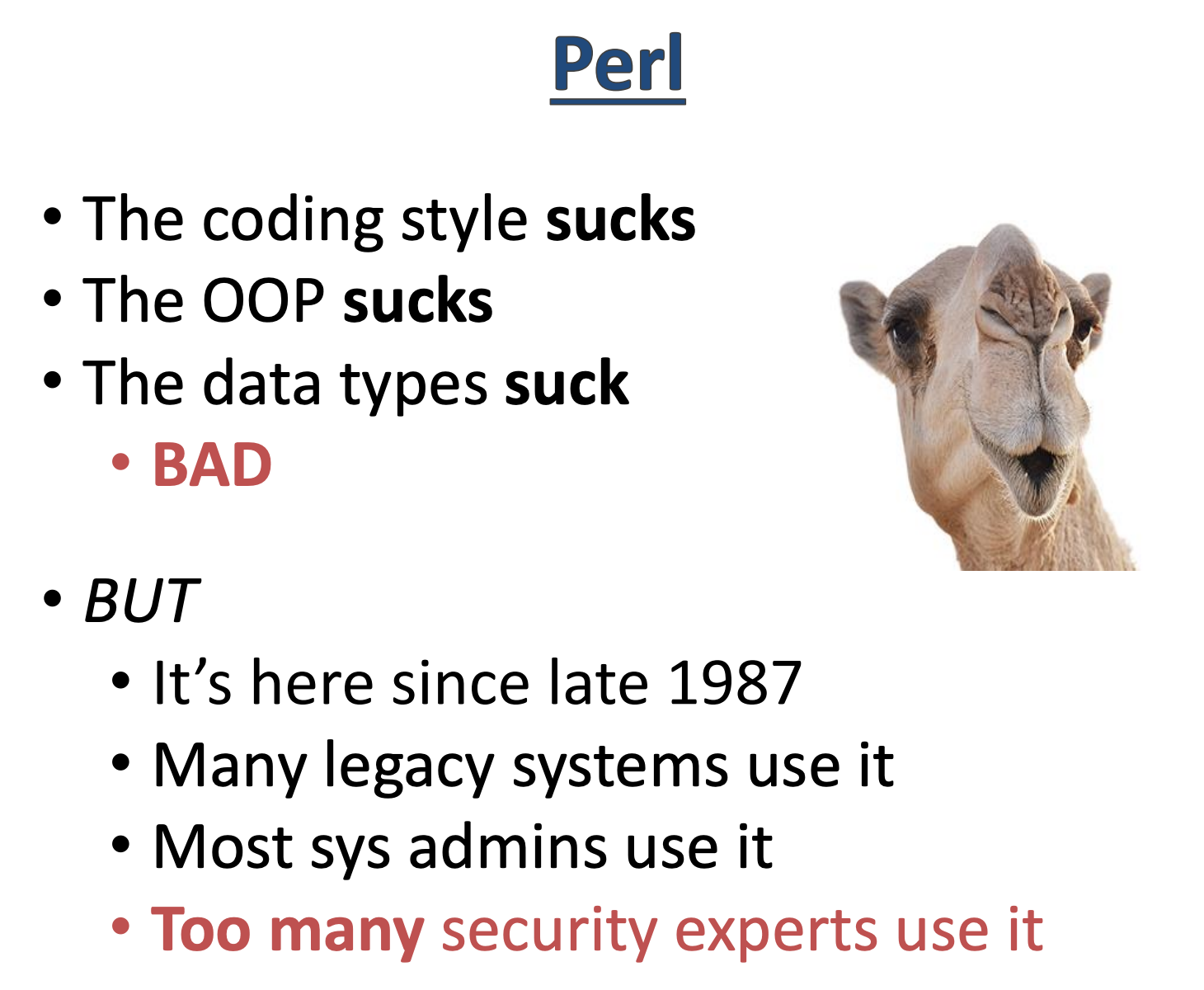 Legacy systems don’t go away, and security experts aren’t (usually) looking to fully appreciate a language (one of the complaints of the Perl rebuttals). Instead, they’re concerned about impacts, and, if we’re being honest, probably some street cred as well.