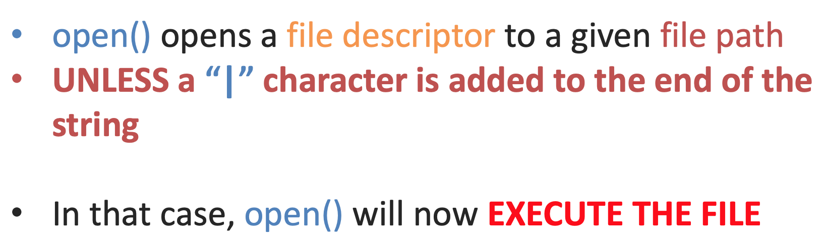 ARGV(that will be opened and read), we can add a|which will print the output of that command or file.