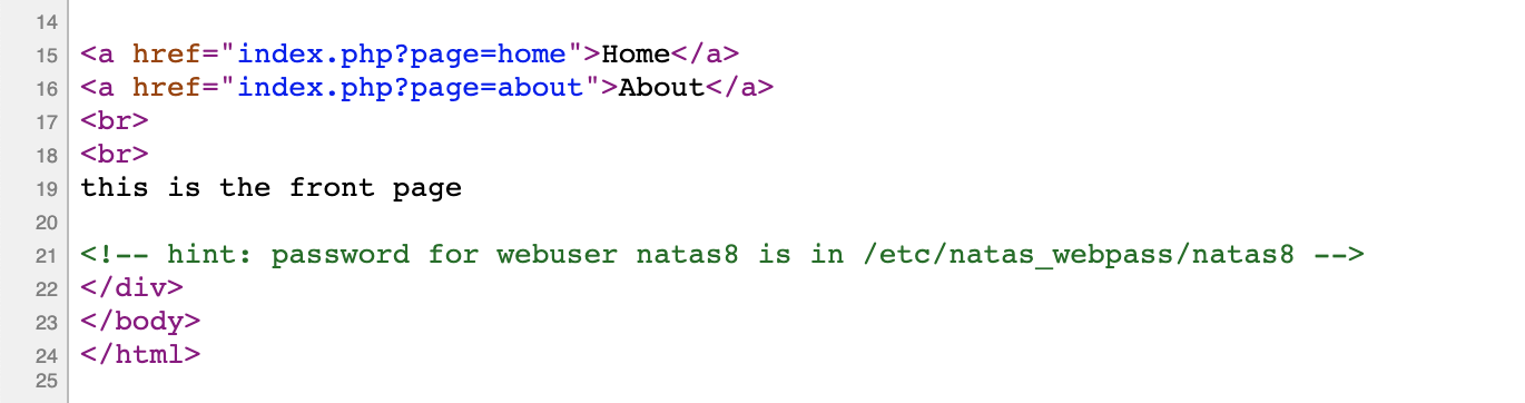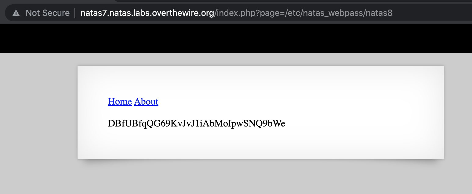 Let’s use the absolute file path option, and navigate to http://natas7.natas.labs.overthewire.org/index.php?page=/etc/natas_webpass/natas8. This will include the flag file and display it to us