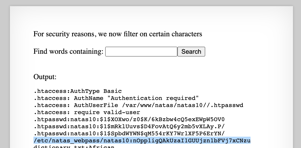 If we follow the pattern from earlier levels, and look in /etc/natas_webpass/natasX, we can enter in a value of .* as our search value (to accept all strings), then a space, then /etc/natas_webpass/natas10.