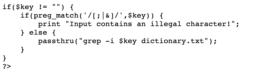 If we look at the source code, it’s very similar to what we had before, with the addition of a regex (/[;|&]/) that checks for ;, |, and &.